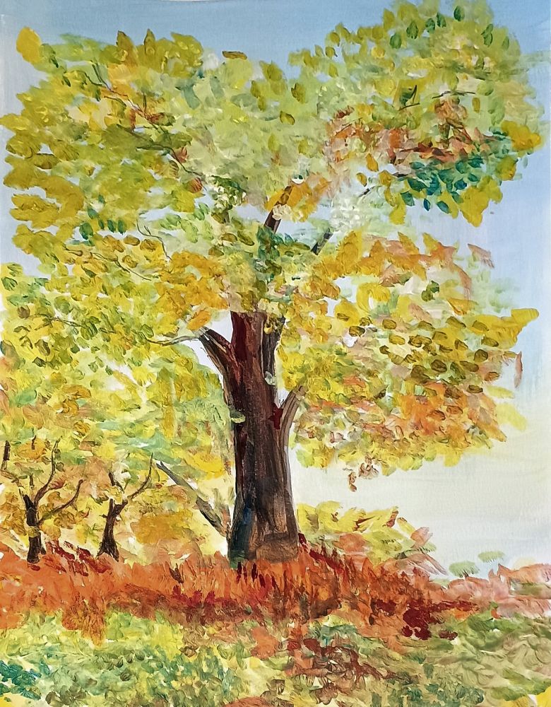 The subject of the workshop was to paint a woodland scene in acrylics, a scene that was based on photographs supplied by Nigel. The morning session started with getting used to mark making with oil pastels on paper, the method being to create a picture that gradually appears by firstly making areas of light coloured marks that then get overlaid with darker colours, and the final result gradually appears on the page. The afternoon session focused on producing a finished picture, based on the oil pastel one, but using acrylic paints as the medium.