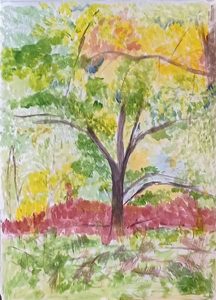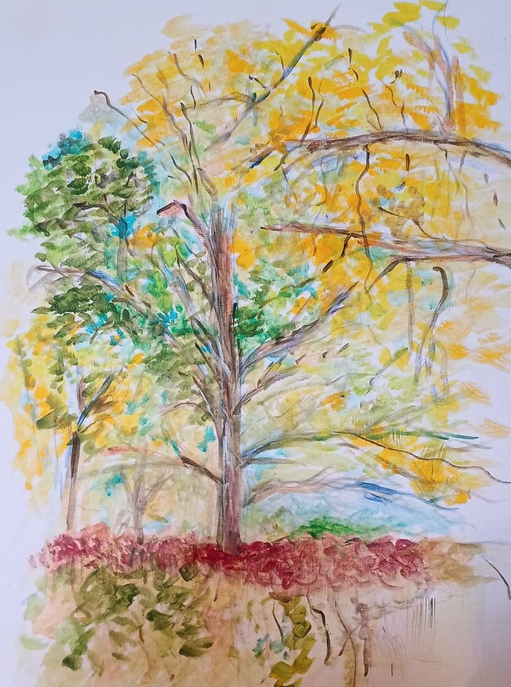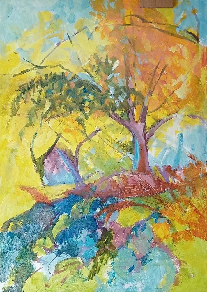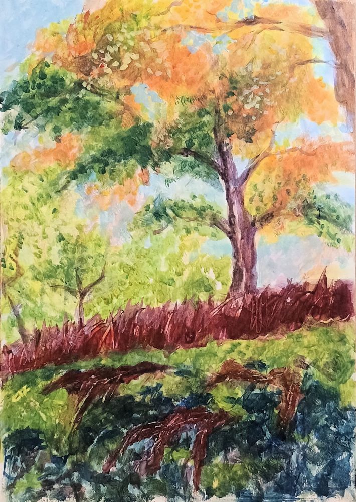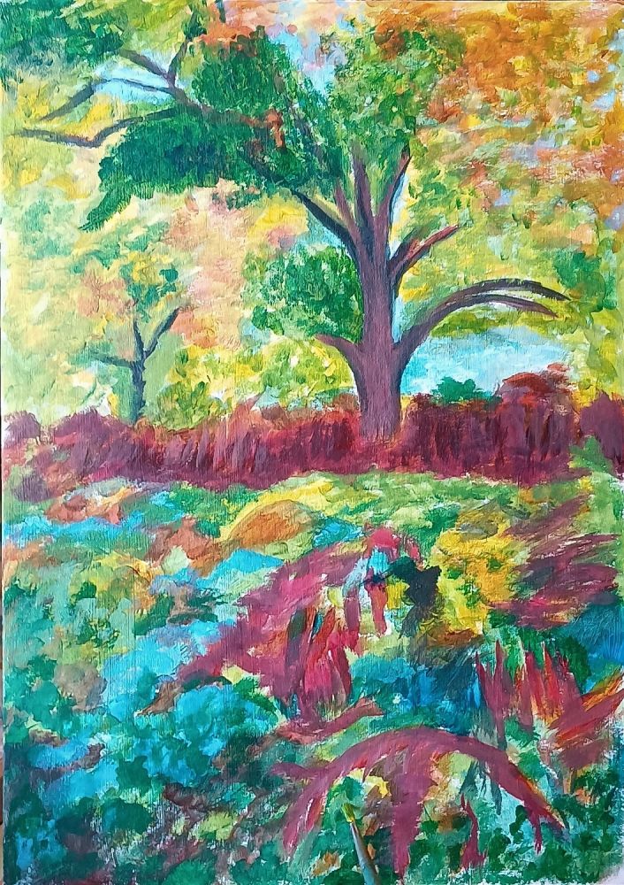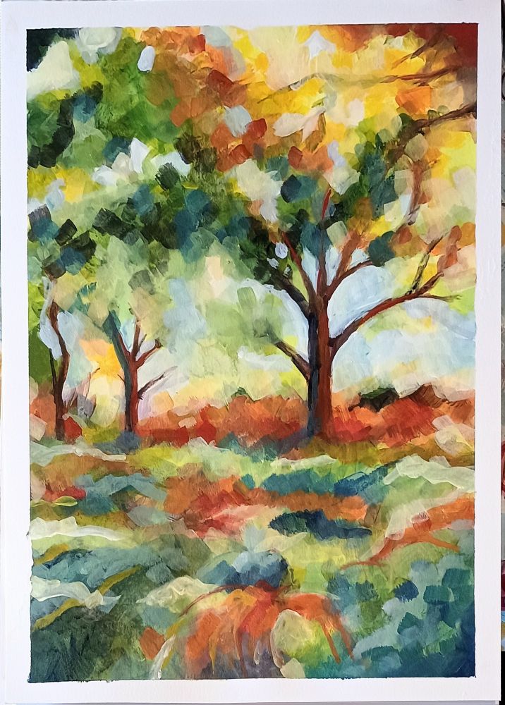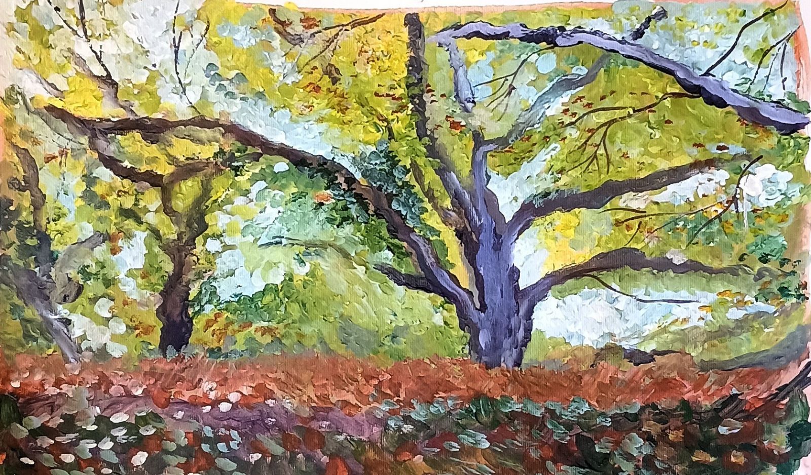 The subject of the workshop was to paint a woodland scene in acrylics, a scene that was based on photographs supplied by Nigel. The morning session started with getting used to mark making with oil pastels on paper, the method being to create a picture that gradually appears by firstly making areas of light coloured marks that then get overlaid with darker colours, and the final result gradually appears on the page. The afternoon session focused on producing a finished picture, based on the oil pastel one, but using acrylic paints as the medium.