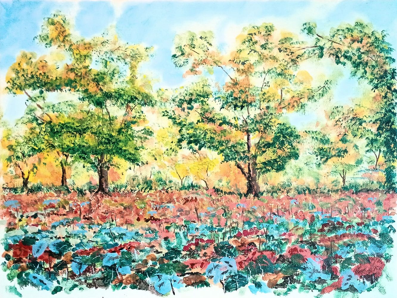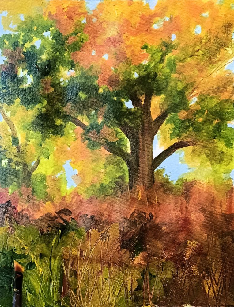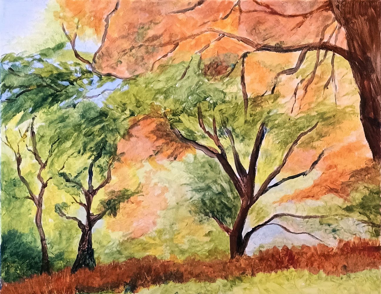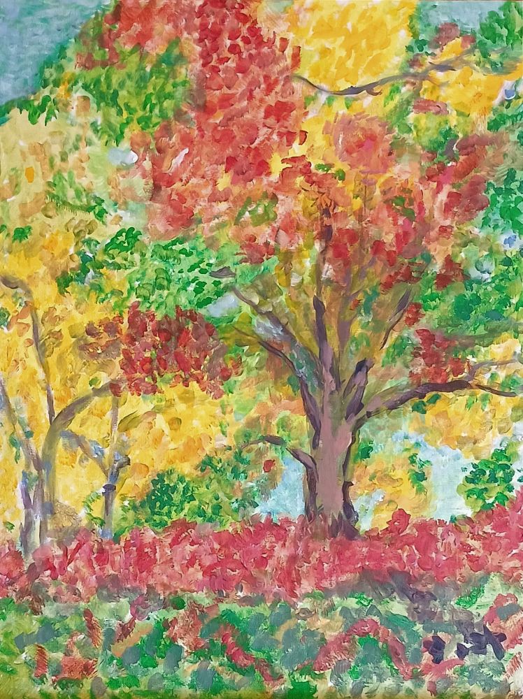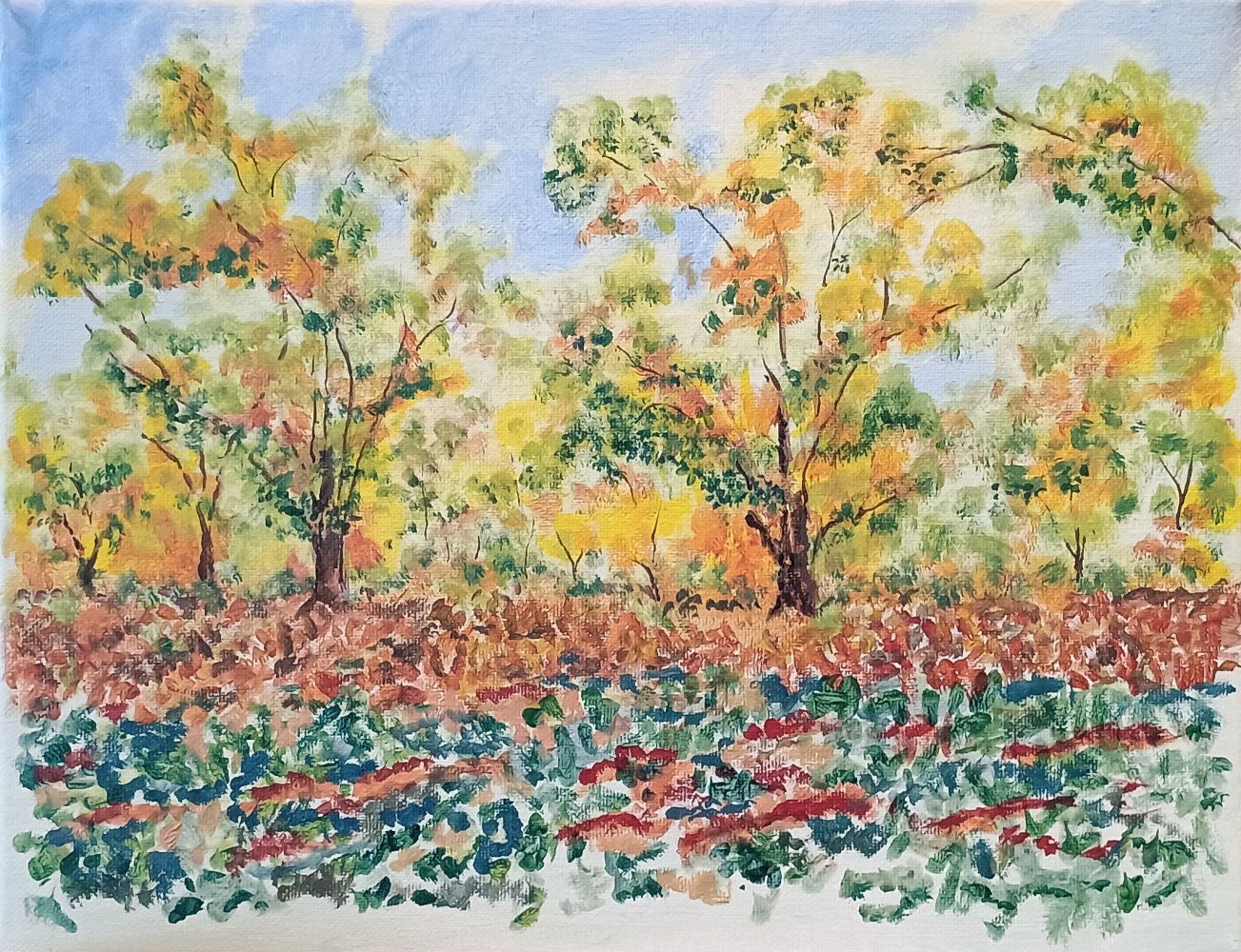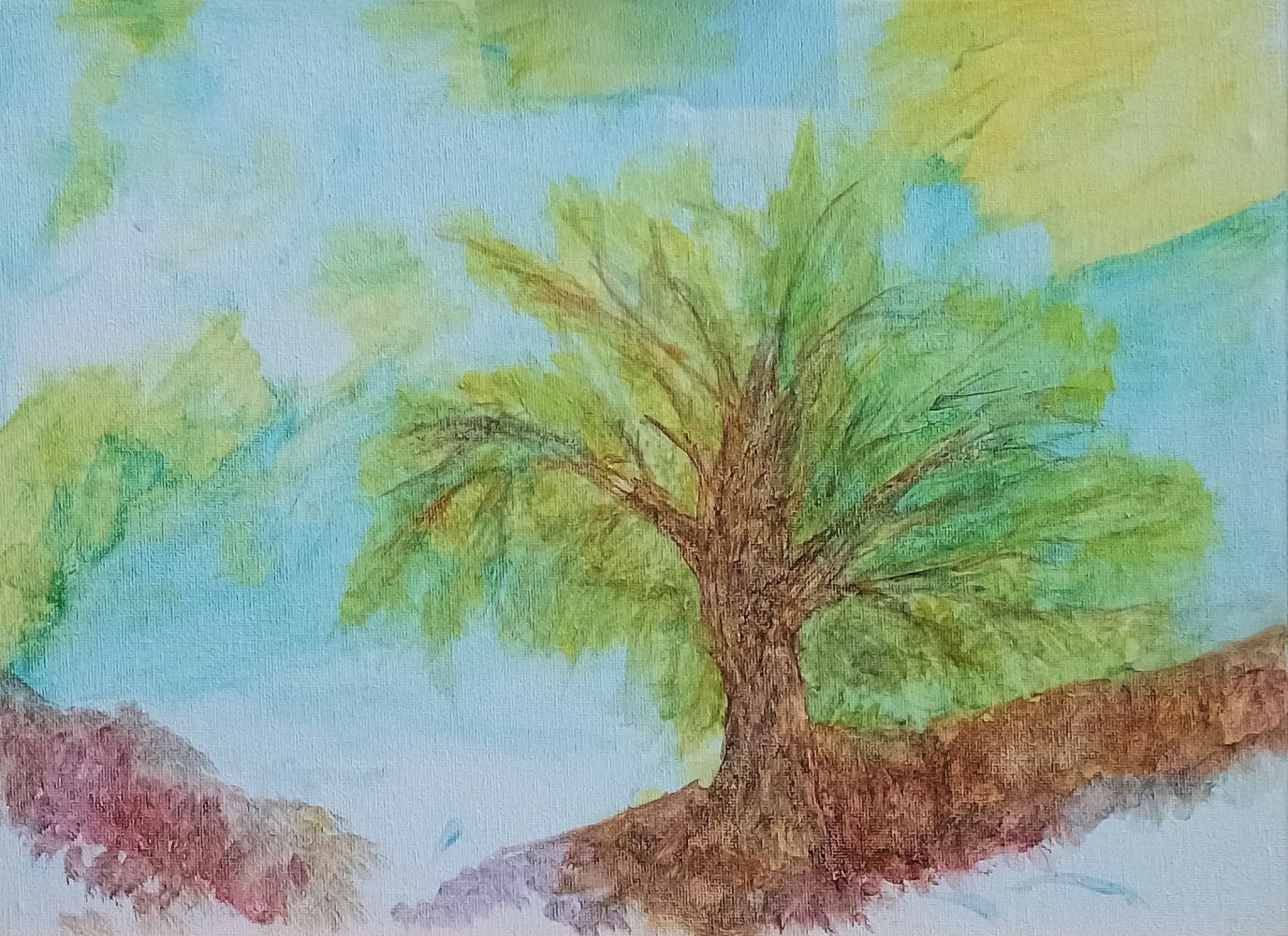 The subject of the workshop was to paint a woodland scene in acrylics, a scene that was based on photographs supplied by Nigel. The morning session started with getting used to mark making with oil pastels on paper, the method being to create a picture that gradually appears by firstly making areas of light coloured marks that then get overlaid with darker colours, and the final result gradually appears on the page. The afternoon session focused on producing a finished picture, based on the oil pastel one, but using acrylic paints as the medium.